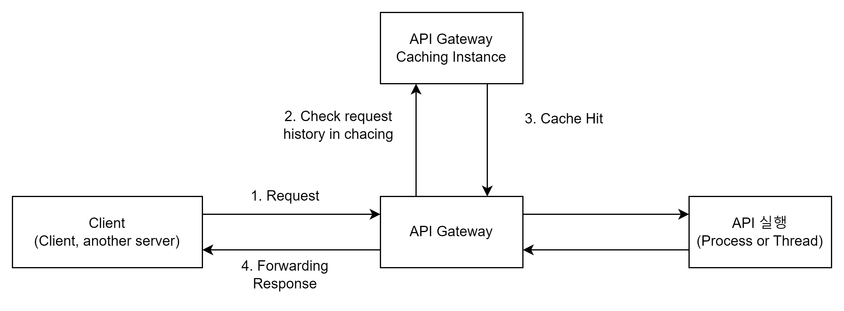 만약, cache miss(캐시에 데이터가 없는 경우)가 발생하면, 정상적으로 API 실행을 과정이 진행됩니다. 클라이언트로 응답을 전송한 이후 또는 전송 이전에 API Gateway 캐싱 인스턴스로 응답을 저장하여 이후에 동일한 요청이 왔을 때 캐싱처리를 할 수 있도록 합니다.