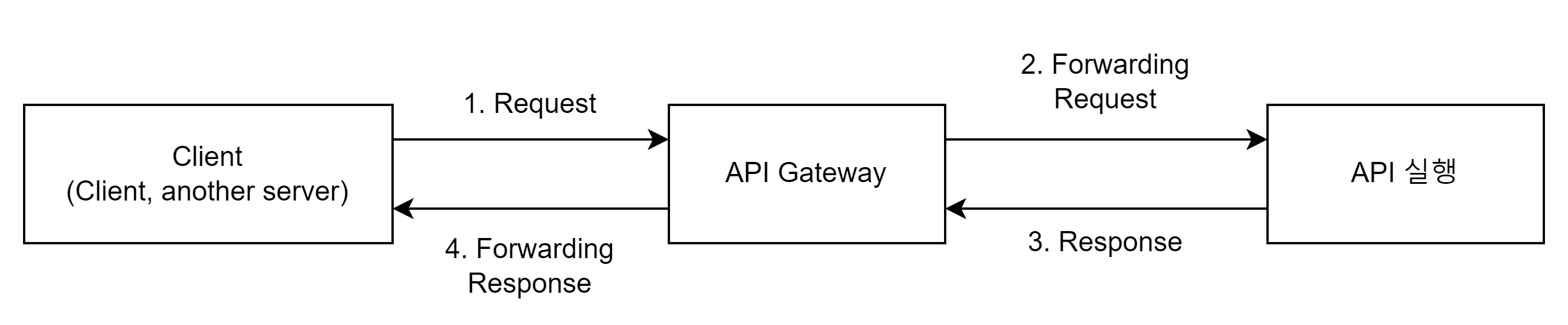 클라이언트는 웹 브라우저 또는 다른 서버가 될 수 있습니다. 여기서 API는 널리 알려져 있는 REST API 또는 HTTP API입니다. Request라 하면, HTTP의 호출 method 중 GET, POST, PUT, DELETE 중 하나라고 이해하시면 됩니다. API Gateway는 클라이언트로부터 API 요청을 제일 먼저 수신받아, 권한, 인증, 로드밸런싱, 리다이렉트 등 다양한 처리를 할 수 있는 인스턴스입니다. 여기서는 API 요청을 리다이렉트 하여 API 실행( 프로세스 또는 스레드를)을 담당합니다.
