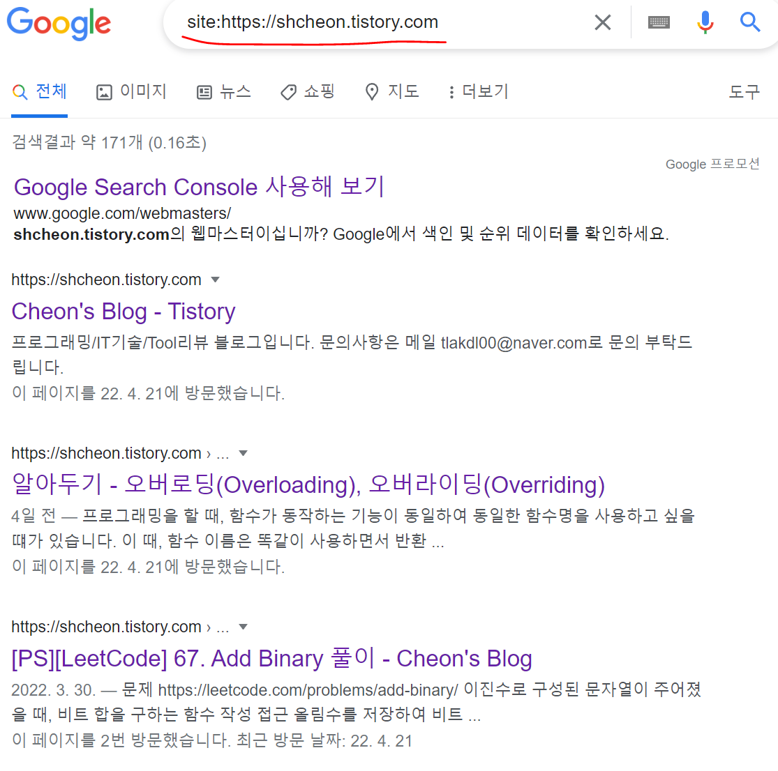 구글에서도 네이버 서치 어드바이저처럼 site:URL 주소를 검색하면, 블로그 포스팅이 구글 검색에 노출 여부를 바로 확인할 수 있습니다.