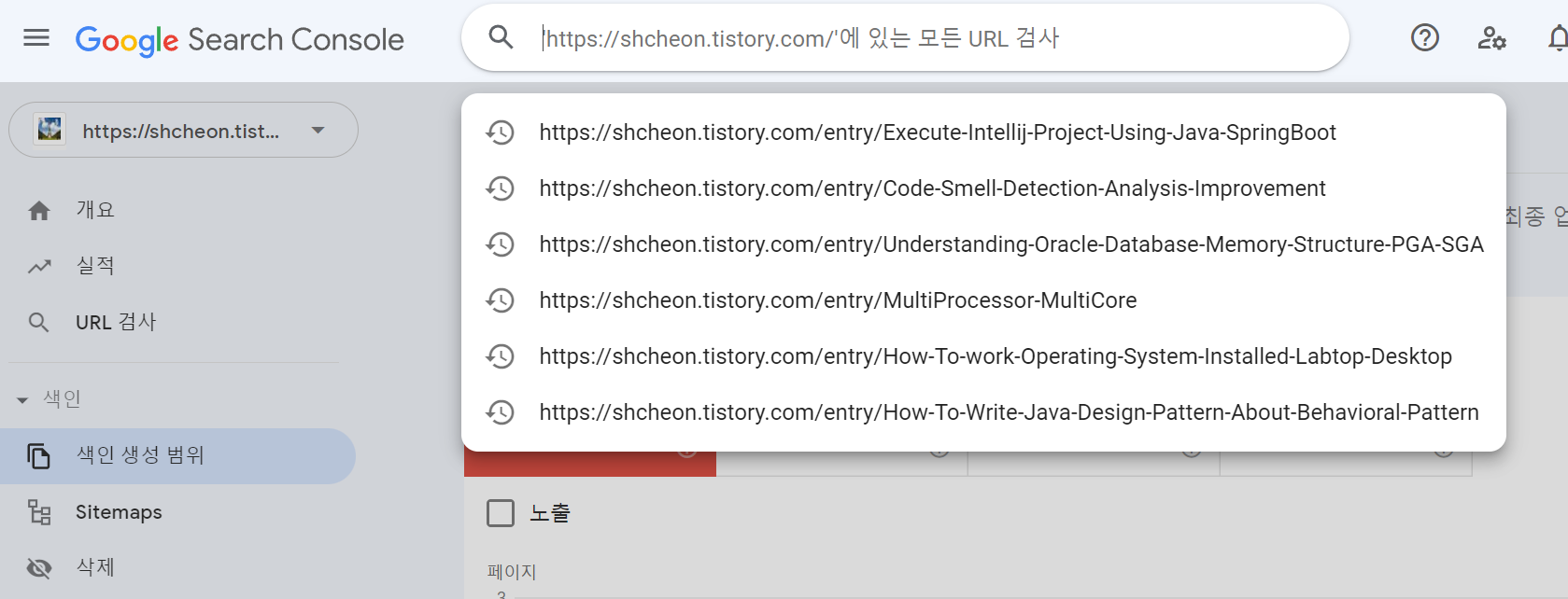 그리고 마지막으로 URL 검사를 통해, 웹페이지 수집 여부 및 색인 생성 요청을 할 수 있습니다. URL 검사 메뉴를 누르시면, 검사할 URL을 입력할 수 있습니다. 블로그 메인 페이지만 입력하면, 구글 크롤러가 해당 웹사이트 하위 URL도 다 검색하고 수집하겠지만, 크롤러도 우선순위가 있기 때문에, 제 Page가 먼저 수집될지 안될지는 잘 모릅니다.