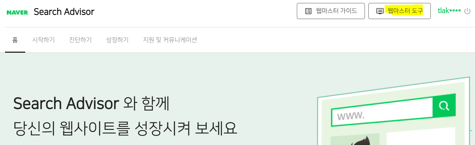 네이버 서치 어드바이저에 외부 사이트 URL을 입력하면, 네이버 검색에 노출시킬 수 있습니다. 지금부터 네이버 검색에 외부 사이트를 등록하는 방법을 알려드리겠습니다. 먼저, 서치 어드바이저에 접속하여, 로그인 후 웹마스터 도구 버튼을 클릭합니다.