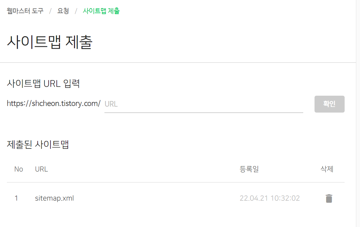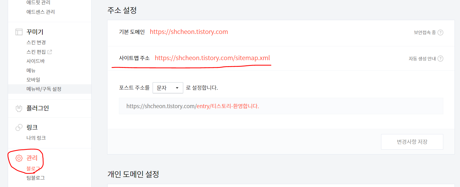 sitemap은 티스토리 블로그 관리 > 블로그 > 주소 설정에서 사이트맵 주소를 확인하실 수 있습니다.