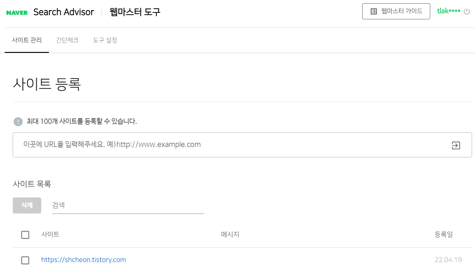 웹마스터 도구 메뉴에 진입하면, 사이트 등록 화면이 나타납니다. 여기서 티스토리 블로그 사이트 주소 URL을 입력합니다.