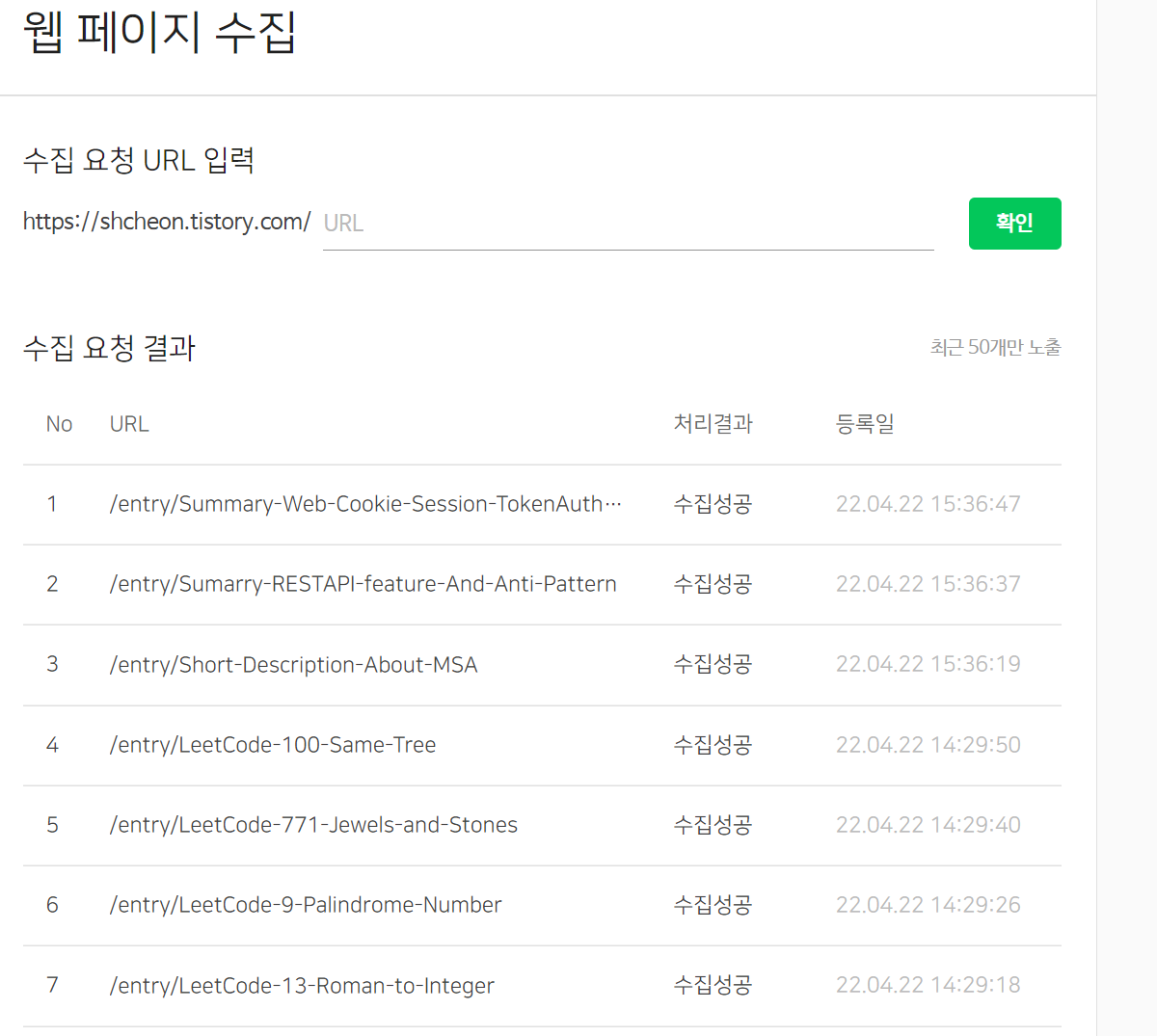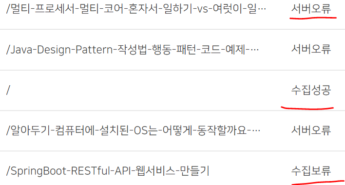 입력한 웹 페이지의 URL 정보가 잘못 되었을 경우, 처리 결과에 서버 오류 또는 수집 보류 상태가 될 수 있습니다.