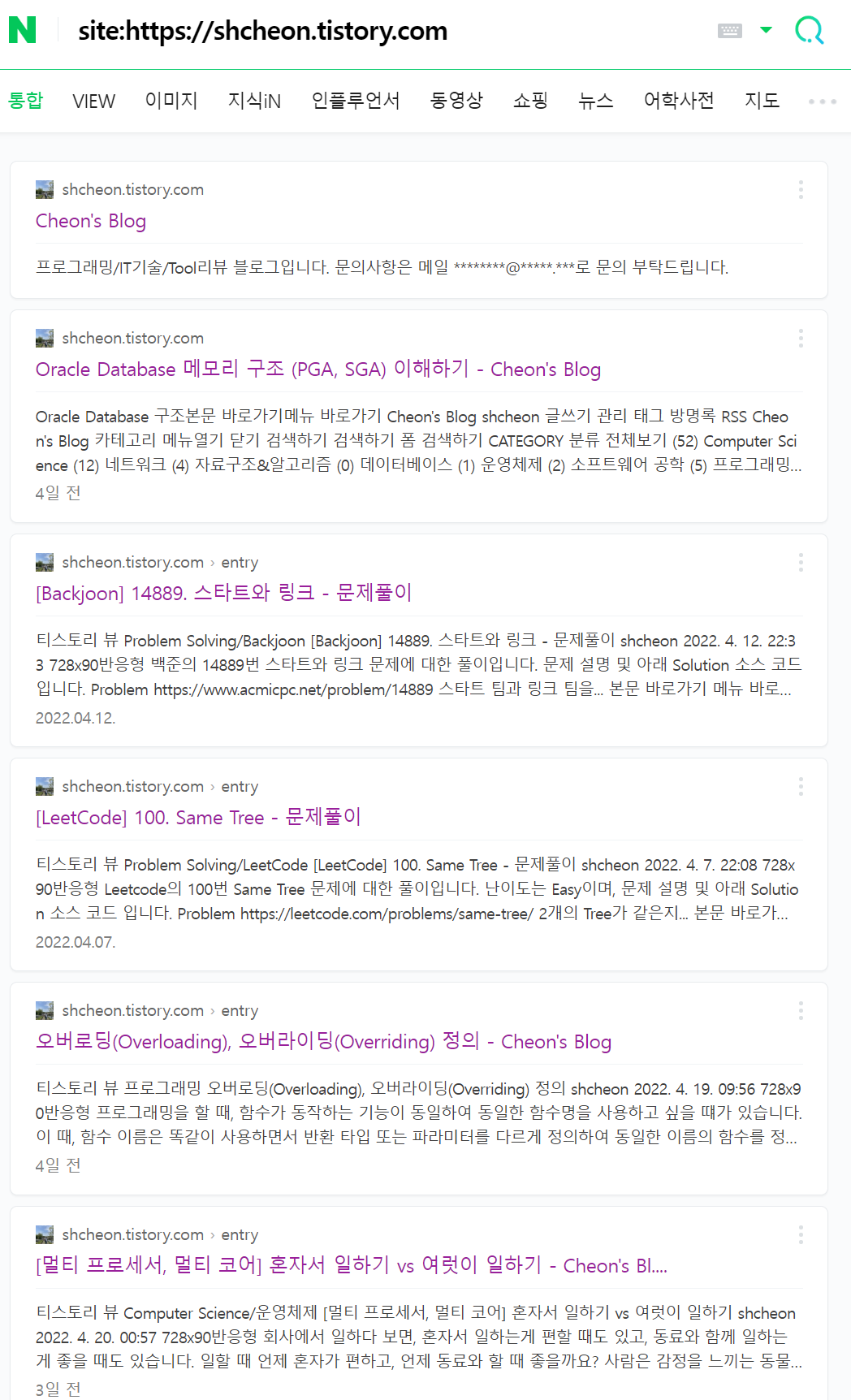 수집 성공된 페이지는 네이버 검색에 바로 노출되지 않고, 시간이 좀 지난 뒤에 검색하면 검색에 노출됩니다. 네이버에 검색 노출이 잘되는지 안되는지 바로 볼 수 있는 검색어가 있습니다. site:블로그 URL을 입력하면, 네이버 검색에 등록된 도메인 하위 URL에 대해 모두 출력됩니다. 검색에 등록 블로그 포스팅이 노출된다면, 네이버 검색 등록을 성공하신 겁니다.