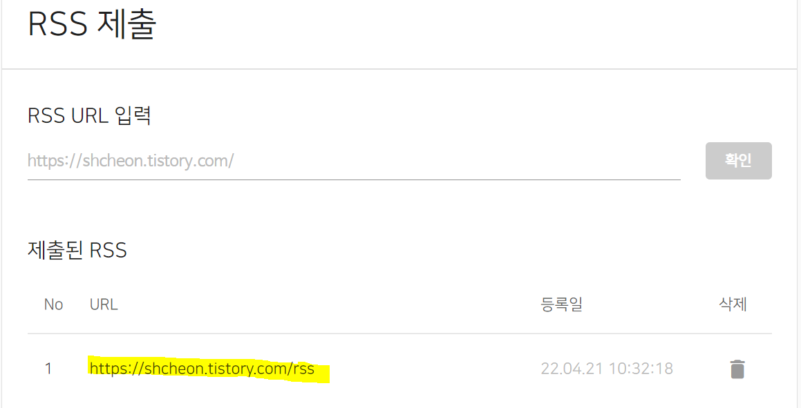RSS와 사이트맵을 등록하는 이유는 웹 사이트의 정보를 수집하는 크롤러에게 사이트 정보를 알려주어야, 크롤러가 웹 페이지의 정보를 수집할 수 있기 때문입니다. 그러므로, 먼저 RSS와 사이트맵 제출을 수행합니다. RSS는 티스토리 URL의 마지막에 RSS를 입력하면 끝입니다.