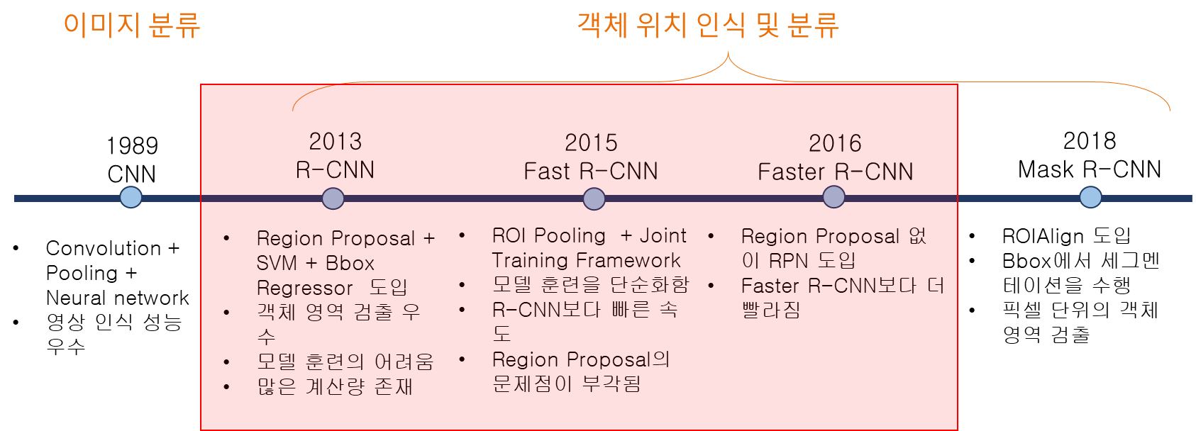 이번 포스팅에서는 CNN의 연구동향에 대해 간략히 살펴보겠습니다. CNN은 클라우드 컴퓨팅, 병렬 컴퓨팅 기술과 하드웨어의 성능이 향상되어 최근 주목받게 된 알고리즘입니다. CNN은 추론 성능은 우수하지만, 많은 데이터셋과 계산량이 필요하여, 이를 개선하여 탄생한 알고리즘이 R-CNN입니다. R-CNN의 연구동향은 아래와 같이 정리할 수 있습니다.