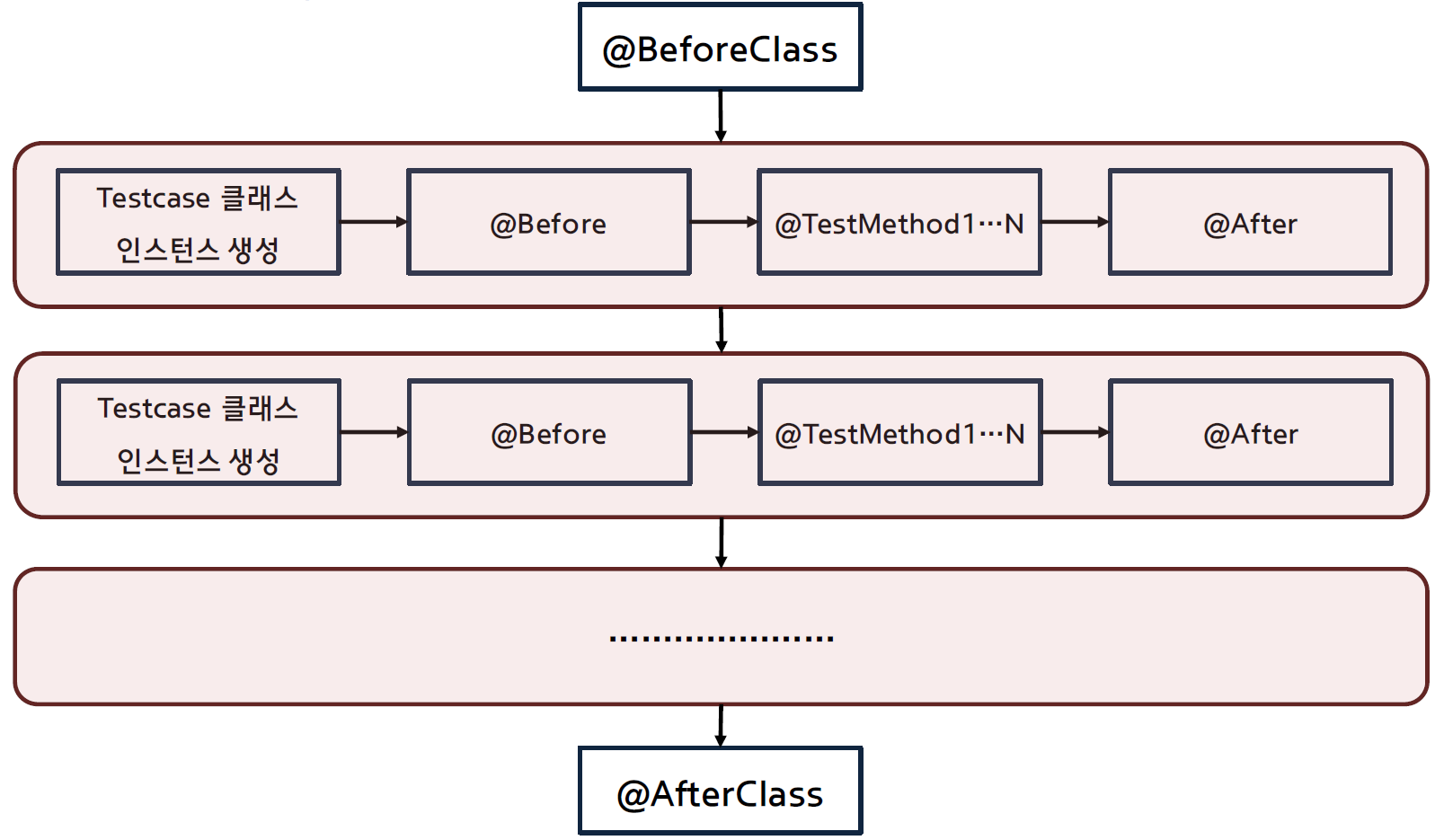 JUnit은 어노테이션이 지정된 메서드 또는 클래스를 실행합니다. JUnit은 @BeforeClass로 지정된 클래스를 가장 먼저 실행하고, 그 이후로는 @Test, @Befre, @After로 지정된 메서드를 실행합니다. 테스트 케이스가 모두 실행 완료되면 @AfterClass로 지정된 클래스가 실행됩니다. 아래 이미지를 참고하시면, JUnit의 실행 순서를 쉽게 이해하실 수 있습니다.