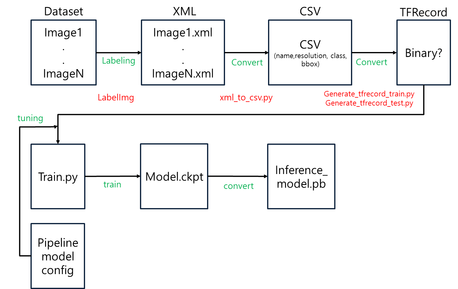 위 과정은 아래 명령어를 순차적으로 실행하면 학습용 데이터셋인 TFRecord를 생성할 수 있고,모델 트레이닝, 모델 추론까지 사용가능합니다.