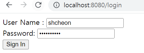 localhost:8080에 접근 시, "/", "/home" URL 접근은 모두 허용하고, 그 외에 사이트는 login 인증을 수행하도록 페이지를 리다이렉션 하도록 설정합니다. 그리고, 접근 권한을 가진 유저는 id는 테스트로 shcheon로 지정하고, 패스워드는 shcheon123으로 설정합니다.