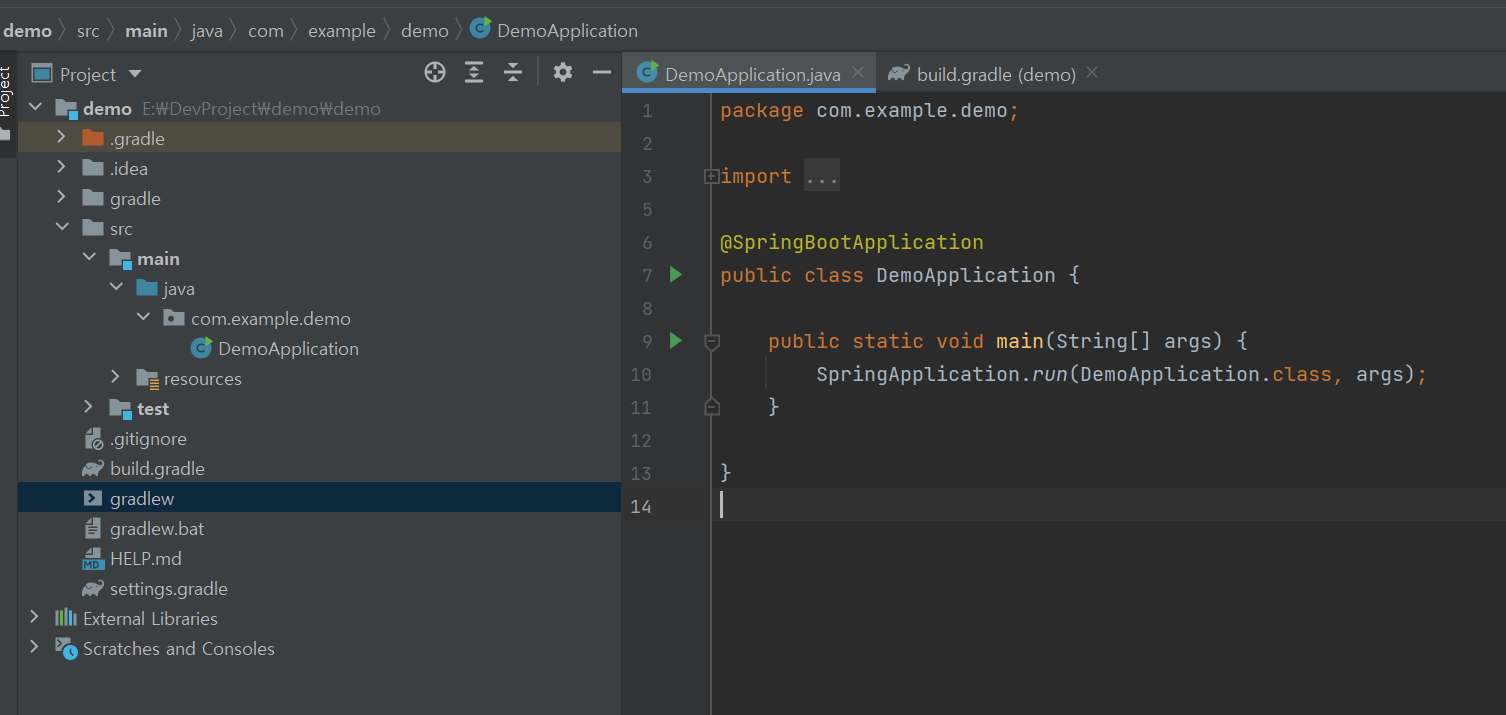 저는 Gradle, Java를 선택하고 프로젝트를 다운로드하였습니다. 이를 IntelliJ로 프로젝트를 열어보면 Gradle빌드에 관련된 build.gradle, gradlew 파일이 있고, src/main/java 폴더에 java로 작성된 소스파일이 있다는 것을 볼 수 있습니다.