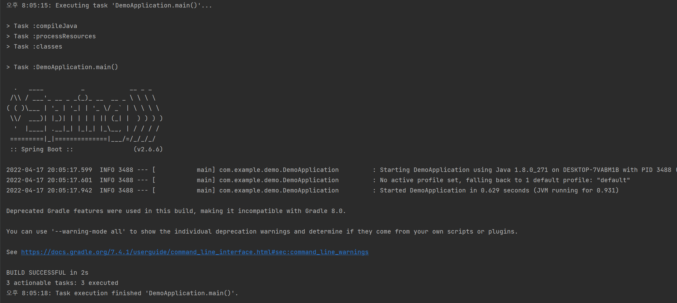 만든 후 DemoApplication을 다시 실행하면, Tomcat started on port(s): 8080 (http) with context path라는 로그를 보실 수 있습니다. 웹서버로 유명한 Tomcat이 실행되었다는 뜻이며, SpringBoot에는 내장된 Tomcat이 있으므로 별도로 Apache Tomcat을 설치하지 않으셔도 웹서버를 실행할 수 있습니다.