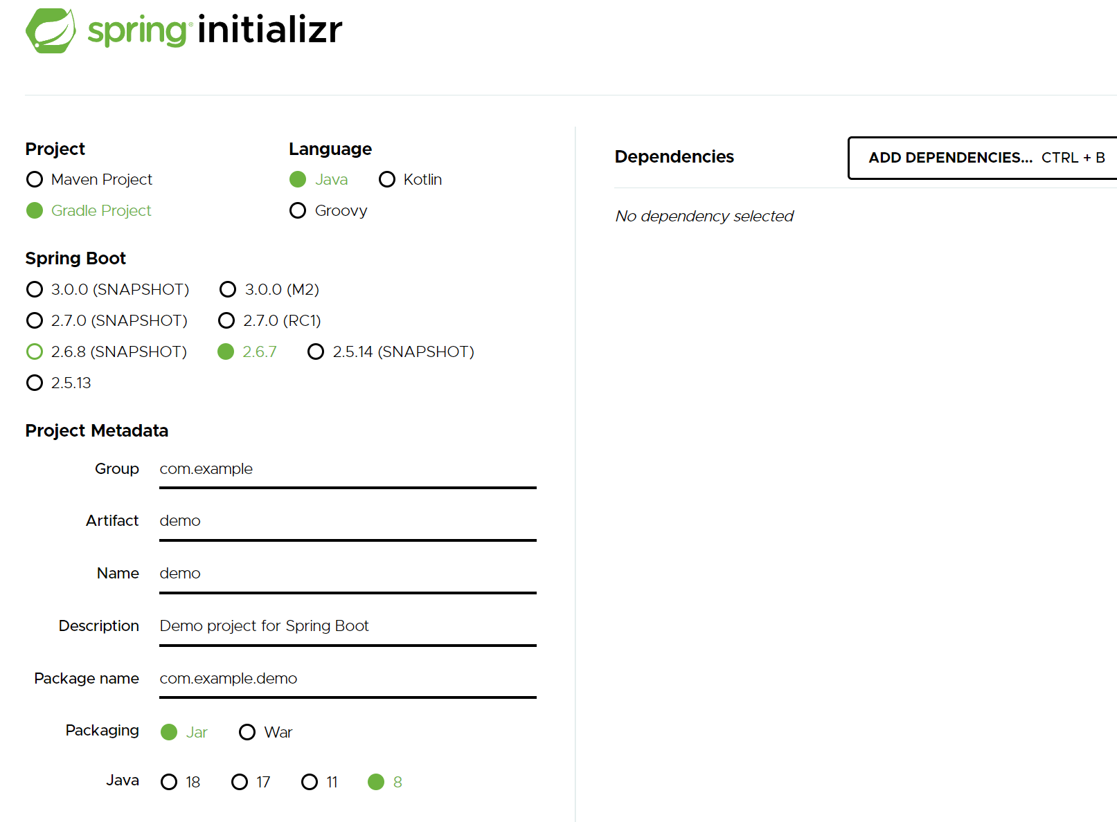https://start.spring.io/ 에서 Dependencies에 별다른 항목을 선택하지 않고, 기본 설정만 선택하고 프로젝트를 다운로드합니다.
