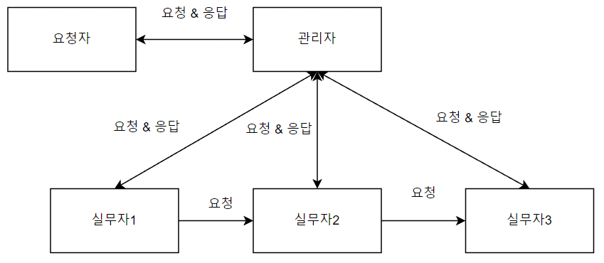 책임 연쇄 패턴을 구현하면, 소스코드의 실행 흐름은 아래와 같습니다. 요청자가 관리자 메서드를 호출하면, 관리자는 실무자 객체에게 처리 요청 메서드를 호출하고, 실무자 1의 담당이 아니라면 실무자 2에게 다시 요청하고, 실무자 2도 동일하게 실무자 3에게 처리를 위임합니다. 앞에서 표현한 것처럼, 폭탄 돌리기 게임과 유사합니다.