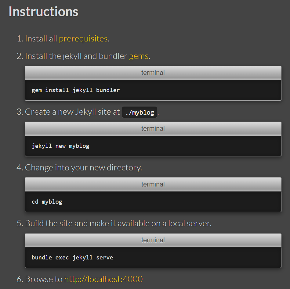 Quickstart메뉴에서 노란색으로 표시된 Requirements를 클릭하시면, Jekyll 실행환경을 구축하는데 필요한 가이드라인이 나와있습니다. 참고하셔서 실행환경에 필요한 소프트웨어를 설치합니다.