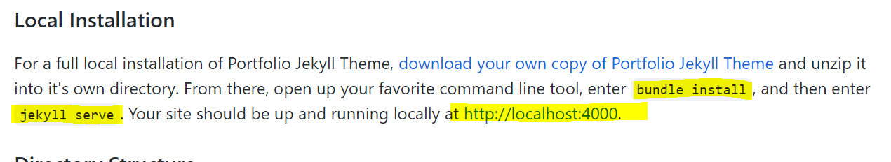 소스가 저장되어 있는 github 사이트의 readme에서 Local Installation을 확인해 보니, bundle install과 jekyll server 명령어를 치면 로컬에서 구동이 된다고 하니, 그대로 실습해보겠습니다.