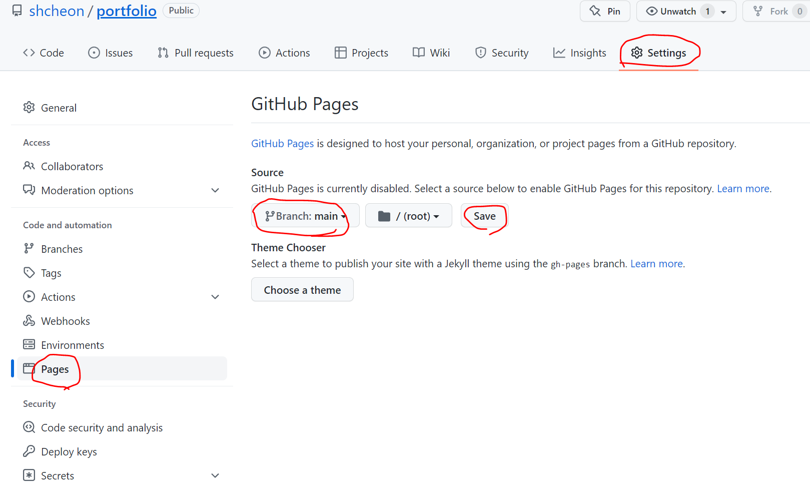드디어, github page를 설정해줄 차례입니다. Repository에서 Settings, Pages, Branch 순서로 메뉴에 진입한 후 Main으로 지정하고 Save버튼을 눌러줍니다.