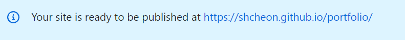 아래와 같이 발행이 될 준비가 되었다는 메시지가 뜨면, Github page를 이용한 호스팅 설정이 끝났습니다. 아래 나와 있는 https://shcheon.github.io/portfolio 가 URL이 됩니다.