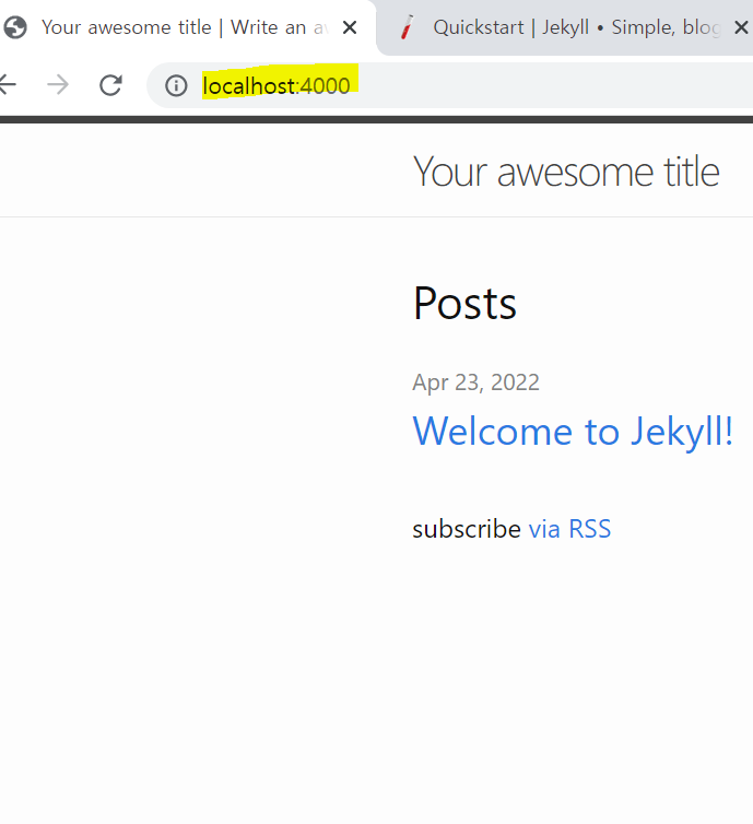 명령어 실행이 성공하였다면, 웹 브라우저 상에서 http://127.0.0.1:4000 또는 http://localhost:4000을 입력하였을 때 아래와 같이 웹사이트가 출력하면 정상적으로 Jekyll 실행환경이 구축된 것입니다.