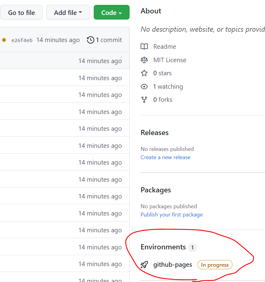 다시 Repository 메인 화면에 들어오면, Enviroments에 github-pages에 웹호스팅 진행상태가 나옵니다.