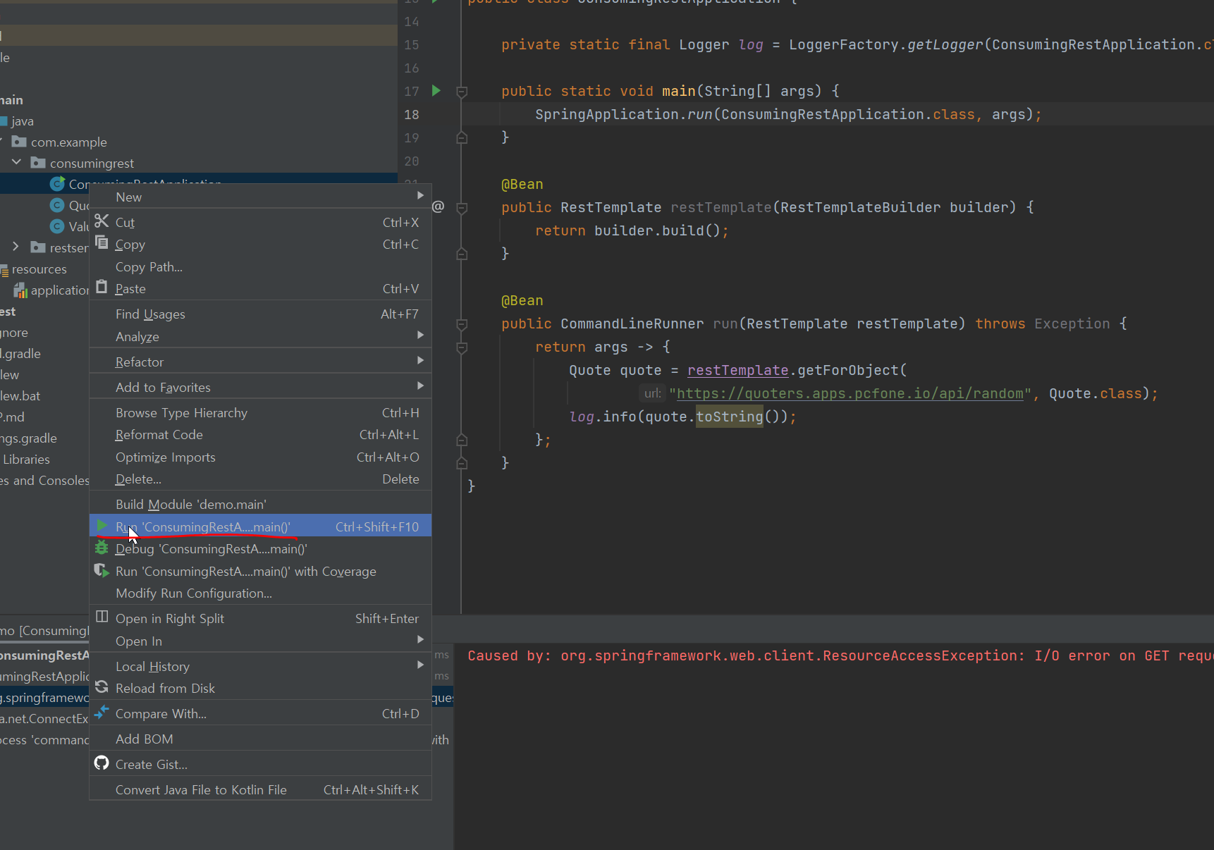 Random SpringBoot quotation이라는 무작위로 문자열을 반환하는 API를 호출하여, 출력하는 클라이언트 프로그램 개발하는 것이 이번 실습의 목표입니다.