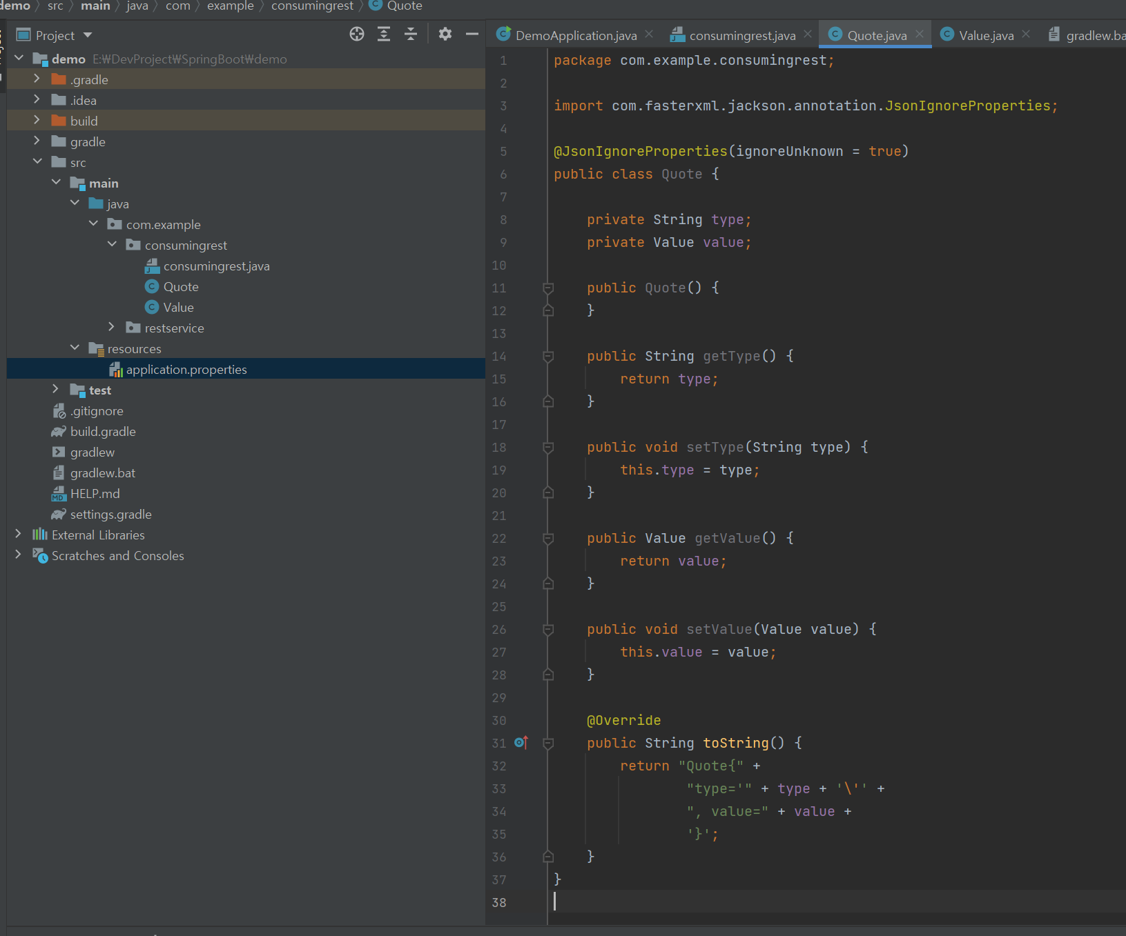 Quote, Value 클래스 정의 시 상단에 명시된 @JsonIgnorePropertise라는 어노테이션은 JSON 속성이 어떠한 프로퍼티와도 매핑되지 않으면 오류가 발생하지만, 이를 무시하겠다고 설정하는 기능입니다. 즉, JSON 매핑 오류로 발생한 오류는 무시하겠다고 이해하시면 될 것 같습니다.