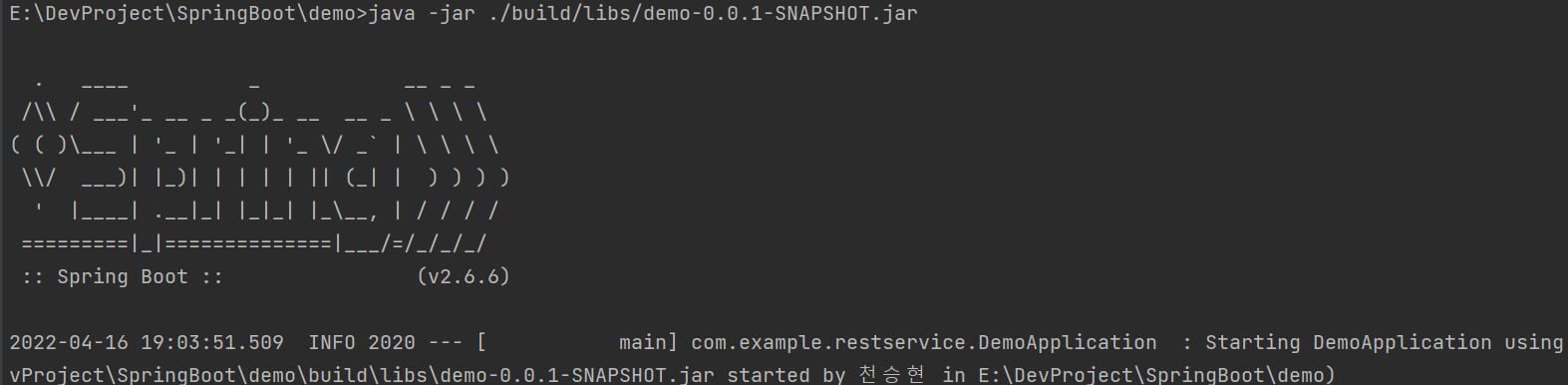 생성된 jar는 gradlew bootrun으로 실행할 수도 있으며, java 명령어로 실행할 수 있습니다. 서버가 실행된 로그를 보시면, apache tomcat이 실행되었다는 로그가 뜨는데, SpringBoot에 tomcat 즉 웹서버가 내장되어 있어 별도의 웹서버가 설치되어 있지 않아도, 로컬에서 웹서버를 실행할 수 있습니다.