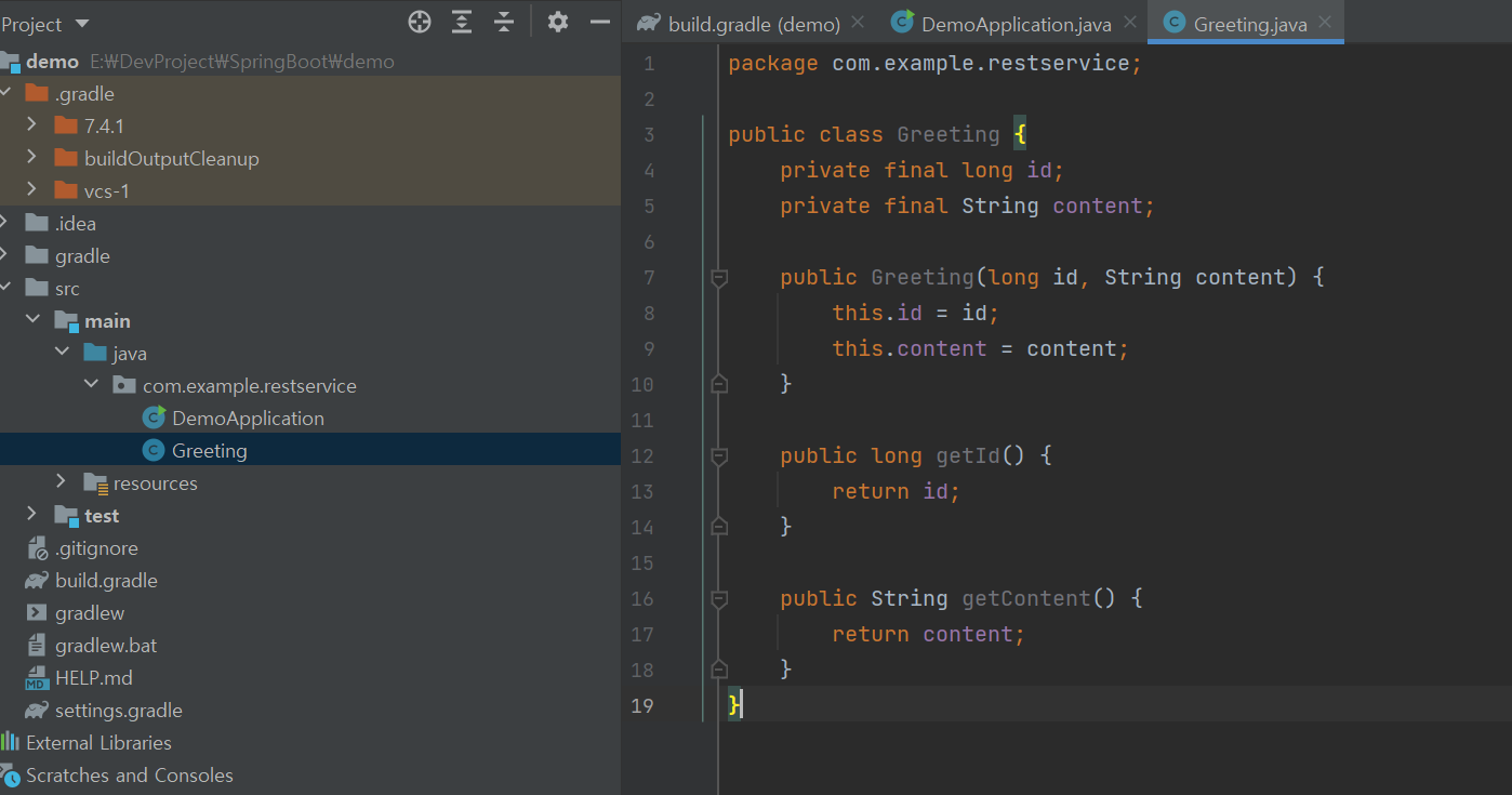src/main/java 폴더 밑에 Resource Representation Class(리소스 표현 클래스)에 해당하는 Greeting 클래스를 생성하여 JSON으로 id와 content를 입력받고 처리할 클래스를 구현합니다.