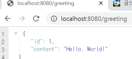Browser에서 GET 요청을 통해, 응답 결과를 확인합니다. /greeting url을 호출 시, JSON으로 id와 content가 응답이 오는 것을 확인할 수 있습니다.