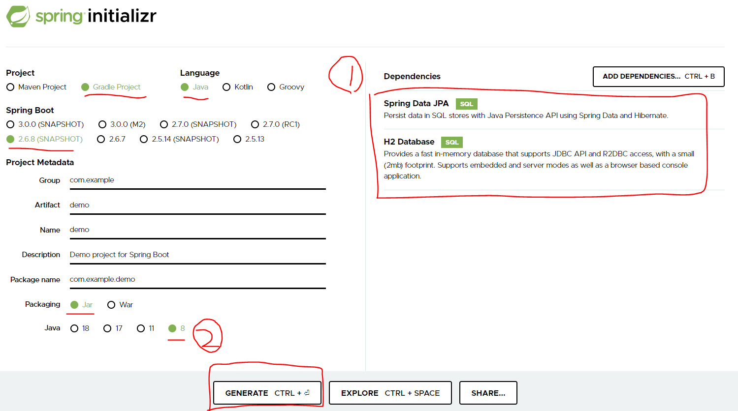 https://start.spring.io/ 사이트에 접속하여, Dependency 항목을 H2 Database, Spring Data JPA를 선택하여 프로젝트를 다운로드합니다. PC에 설치되어 있는 자바 버전에 맞추어, 프로젝트의 자바 버전을 선택하시면 됩니다.