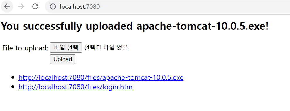 SpringBoot가 정상적으로 실행되고 나면, localhost:7080에 접속합니다. 파일 선택 버튼을 클릭하여, 업로드할 파일을 지정해봅니다. 업로드를 성공하면, 브라우저에서 업로드가 성공하였다는 문구가 출력되고, 업로드 완료된 파일의 최종경로도 브라우저에 출력됩니다.