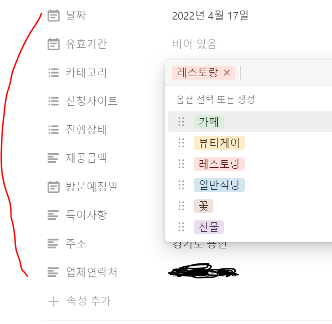 우측 상단에 "공유" 메뉴를 선택하셔서 친구분의 ID 또는 사용자, 이메일, 그룹 등을 입력하여 초대합니다. 초대하실 때 게스트로 초대하신 후, 공유 페이지에서 함께 작업하시면 됩니다. 설정 기능에서 멤버를 추가하시면, 유료버전으로 전환되니 꼭! 공유 기능으로 공동 workspace를 활용하시기 바랍니다. 저는 Notion으로 일정을 캘린더로 작성하였고, 일정 기록할 때 필요한 다양한 항목을 입맛대로 정의할 수 있습니다. 노션의 많은 장점 중 가장 좋다고 생각하는 것은 카테고리와 태그를 손쉽게 추가가 가능하다는 것입니다. 한번 사용된 태그는 다음에도 바로 사용 가능합니다.