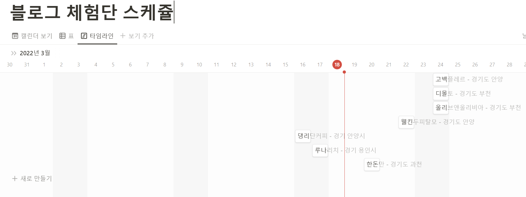 다음으로 좋은 기능은 작성된 일정을 캘린더로 볼 수 있고, 표 또는 타임라인으로도 변환해서 볼 수 있습니다. 하나의 유형으로 데이터를 작성하면, 다른 유형에서도 작성한 데이터를 시각화해서 볼 수 있는 셈이죠. 다른 형식으로 데이터를 새로 작성할 필요가 없기 때문에, 중복작업이 필요 없습니다.
