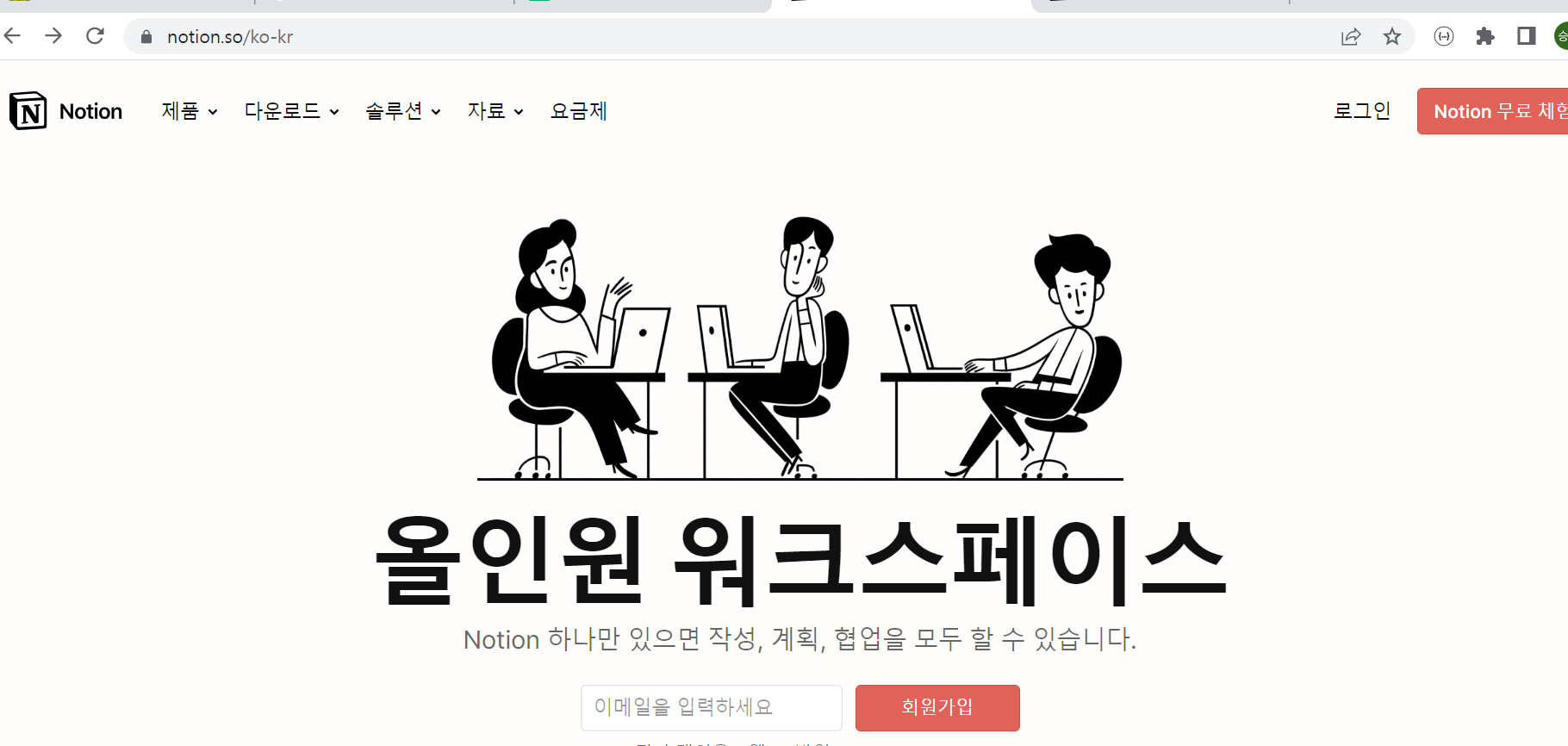 지금부터 제가 사용해 본 Notion 사용방법을 알려드리겠습니다. 제일 먼저 회원가입, 워크스페이스에 진입하는 방법입니다. 먼저, https://www.notion.so/ 사이트에 접속합니다.