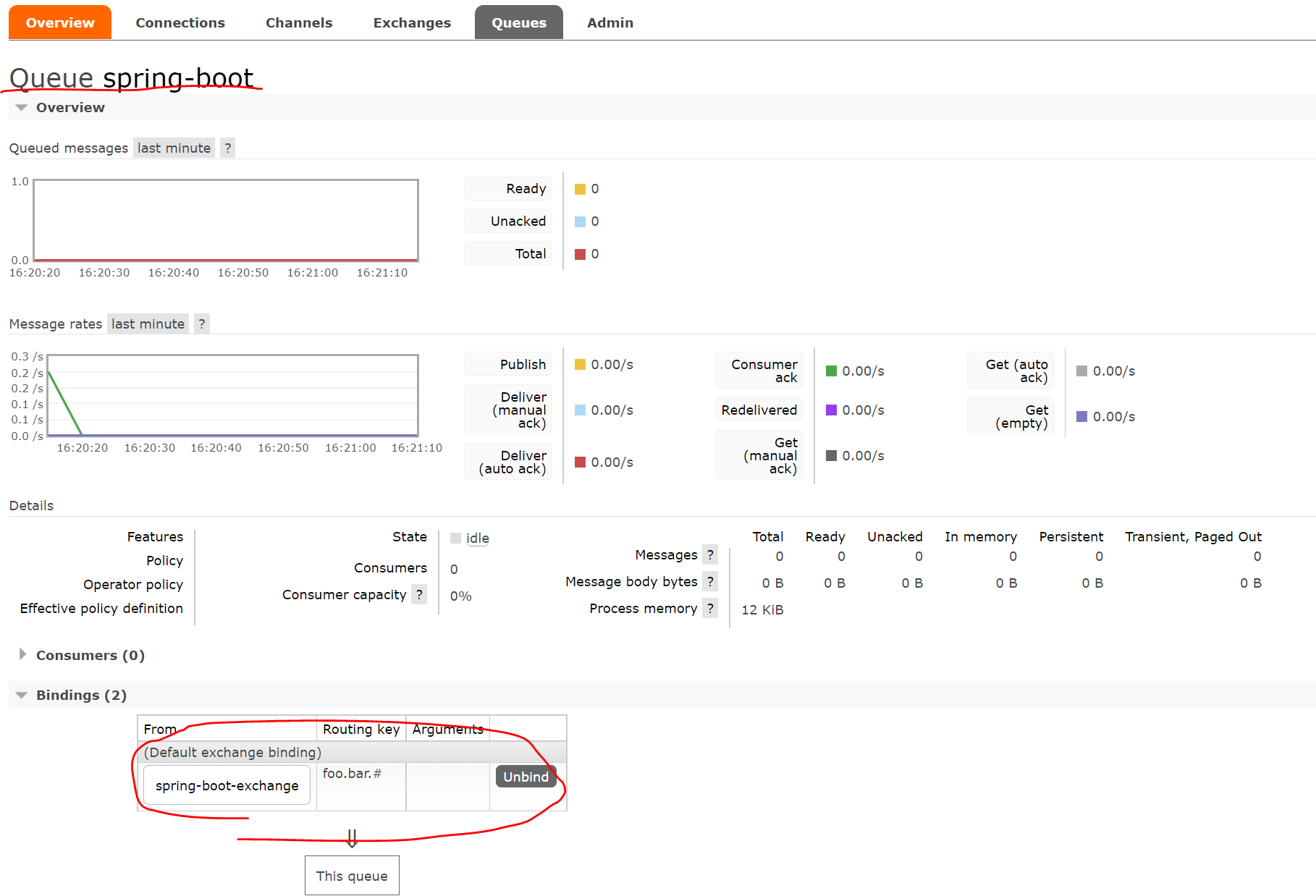 RabbitMQ 관리 화면에 접속하면, 생성된 Queue와 Topic 그리고 RouteKey값을 확인할 수 있습니다.