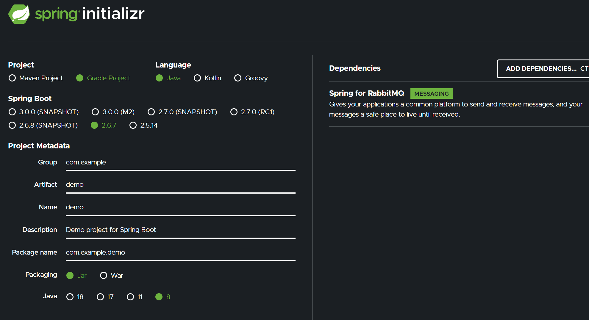 https://start.spring.io/ 사이트에서 Spring for RabbitMQ 디펜던시를 추가하여 프로젝트를 다운로드합니다.