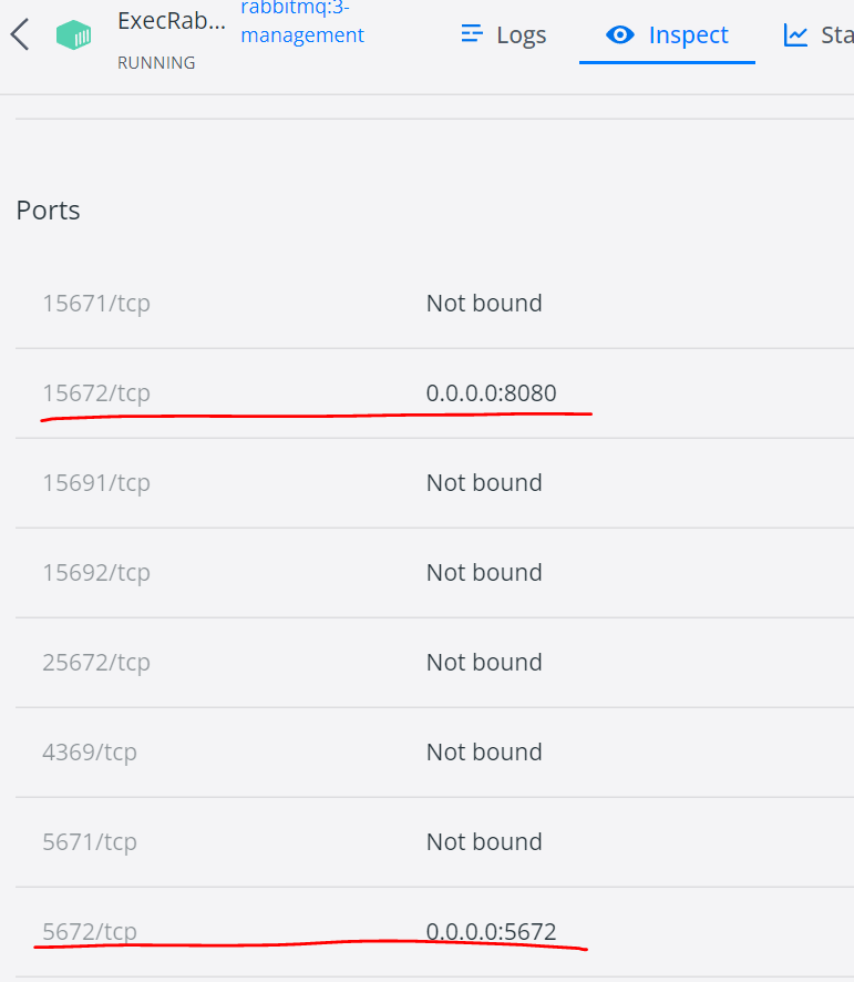 Docker Desktop에서 RabbitMQ 컨테이너 실행의 Inspect를 보면, Port 사용 여부를 확인할 수 있습니다.