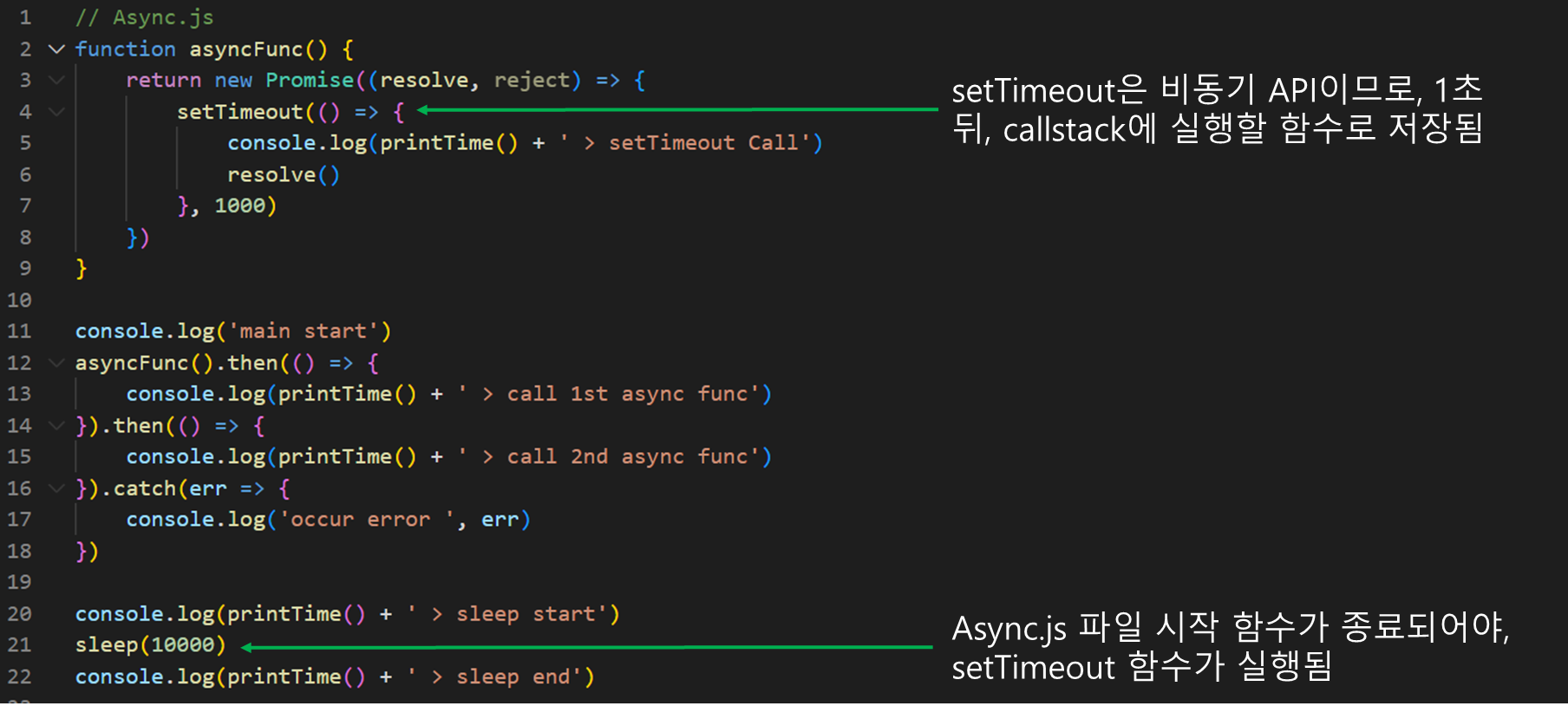 - asyncFunc 함수가 호출되고, Promise 안에 작성된 setTimeout 함수를 실행합니다. setTimeout은 비동기 API이므로, 별도의 스레드에서 실행이 되고, 1초 뒤 setTimeout에 정의한 CallBack함수가 CallStack에 저장됩니다. (Line 4, 12)