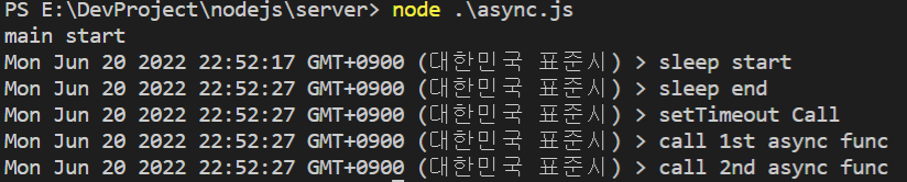 Async.js 파일 실행결과를 보면, sleep 함수가 호출된 후 10초 대기한 뒤 바로 'setTimeout Call'이 출력된 것 결과를 확인할 수 있습니다. Sleep함수에서 10초 동안 반복문을 실행하는 동안 setTimeout함수는 별도의 스레드로 동작하여 1초 후 callback함수를 callstack에 저장하여 다음 실행 흐름을 저장한 것입니다. Sleep함수가 종료되자마자, callstack에 settimeout, then에서 정의한 콜백 함수가 호출되었습니다.