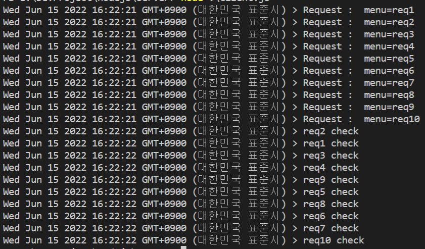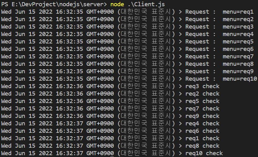 request 함수를 호출할 때, for문을 통해 10번 호출하는데 request 함수는 프로미스 기반으로 동작하여 비동기식으로 HTTP GET Request를 전송합니다. 다음으로 서버를 구현하고 클라이언트를 실행해보겠습니다.
