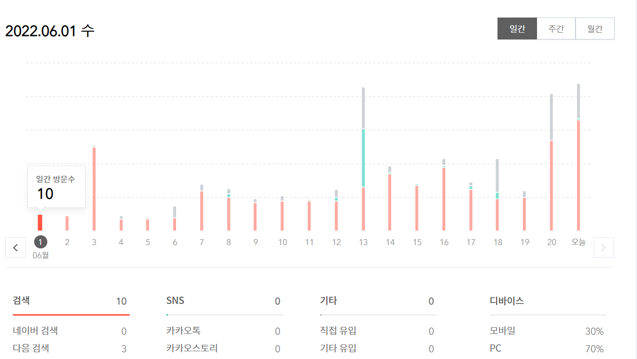 애드센스 심사 결과가 거절되었을 때, 발행한 글의 개수 대비 구글 검색으로 유입되는 방문자가 적었습니다. 월 별로 발행한 글의 개수는 3월 - 1개, 4월 - 20개, 5월 - 23개, 6월 - 10개이고, 4월부터 5월까지 구글 검색으로 유입되는 방문 수는 1 ~ 10 정도였습니다.