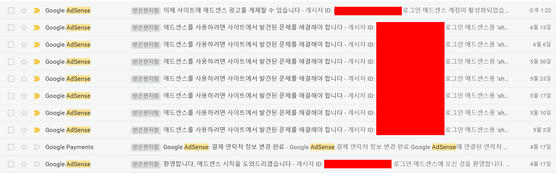 애드센스를 첫 번째 신청할 때는 2주가량 소요되었지만, 그 이후로는 심사 기간이 일주일 정도 소요되었습니다. 아래 그림과 같이, 4월 17일에 처음 애드센스에 가입하여 광고 게재 심사를 신청하였고, 5월 2일에 거절 메일을 받았습니다.
