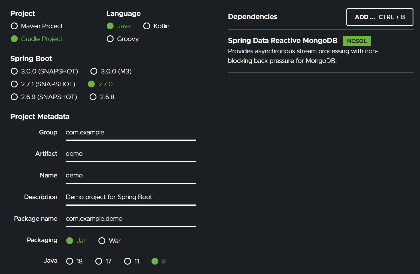 https://start.spring.io/ 에서 MongoDB 디펜던시를 추가하여 스프링 부트 프로젝트를 다운로드합니다.